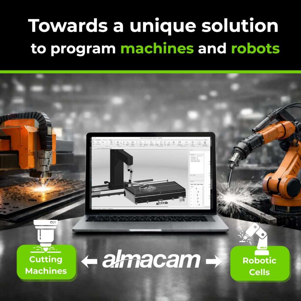 The new version of Almacam now integrates the robotic workflow directly into the software suite. Programming for 2D machines, tubes, 5-axis machines, and robotic cutting and welding cells is now centralized within a single environment.