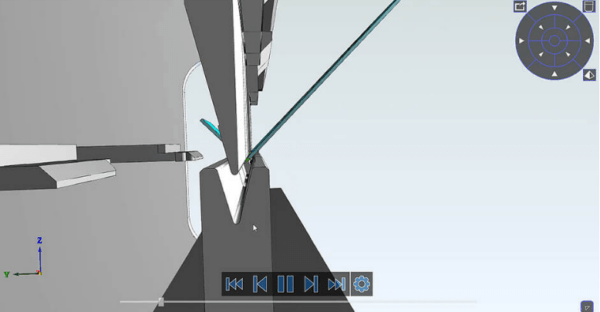 From the model of the part designed in Unfold, the complete 3D simulation of the bending process allows to define every step of the press brake cycle during which the software verifies target accessibility and collision risk.
